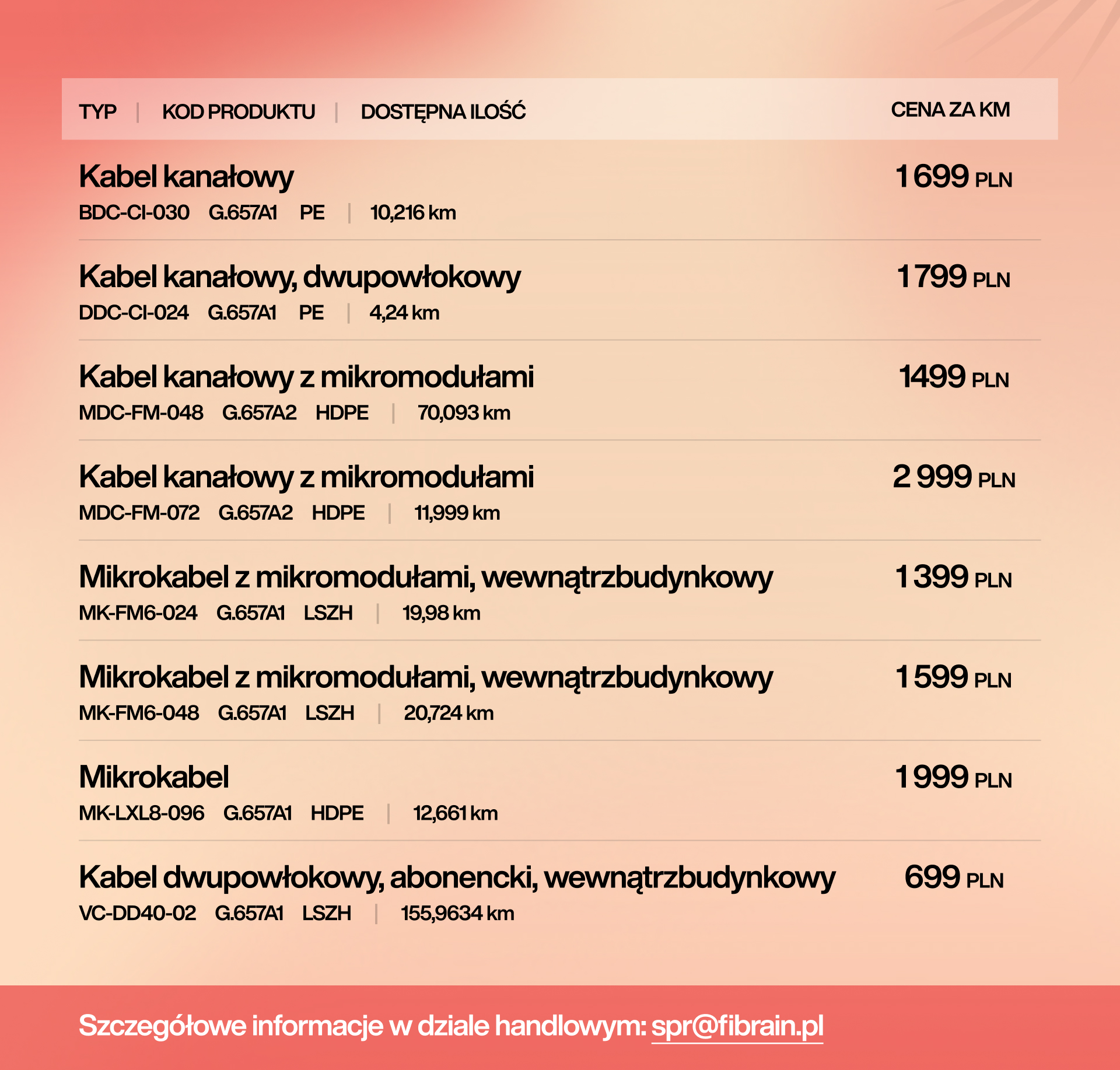 Specjalnie dla naszych klientów i partnerów startujemy z Letnią Promocję w FIBRAIN! W ofercie znajdziecie 9 różnych modeli kabli światłowodowych w atrakcyjnych cenach. Każdy produkt dostępny jest w określonych ilościach, dlatego warto działać szybko.